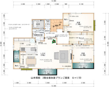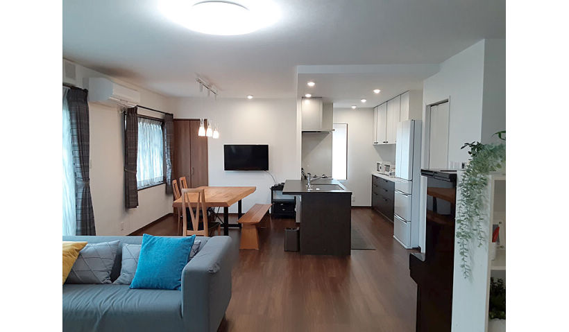 髙橋明彦・米谷久美子 リフォーム前から断捨離をして荷物を減らしておられたY様は2階全面改装への希望を明確に持たれており、対面キッチンや大きめのウォークインクローゼット・一部屋を取り込んだ広いLDK等でした。対面キッチンは場所を移動して既存窓を塞ぎ背にして対面キッチンをとお考えでしたがゴミ出しや空間を広く使うならば今のキッチン位置を少し通路を広めにとってフラット対面にした方がと思い提案しました。冷蔵庫を置いてもW2550の大容量のカップボードを設置できキッチンもスタイリッシュな色合いのLクラスを気に入られました。洗面はすっきりとした一枚カウンターのシーラインを採用し、LDKから廊下をエイジドチーク柄で統一。