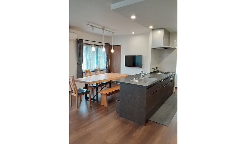 一部屋を取り込んでスペースを広げても、キッチンを移動して窓を塞いで背にした対面にするのはあまり広く感じないと思い、現状の位置で壁を撤去し、使い易い通路を確保するために少しキッチンを前に移動させた。フラット対面ですっきりとさせカップボードも色味を統一し、吊り戸はホワイトで広く感じるように提案。各個室は少し縮小して大きなウォークインクローゼットを新設する事で使い易くしまいっぱなしにならないように奥様のご希望に沿って内部を造作した。