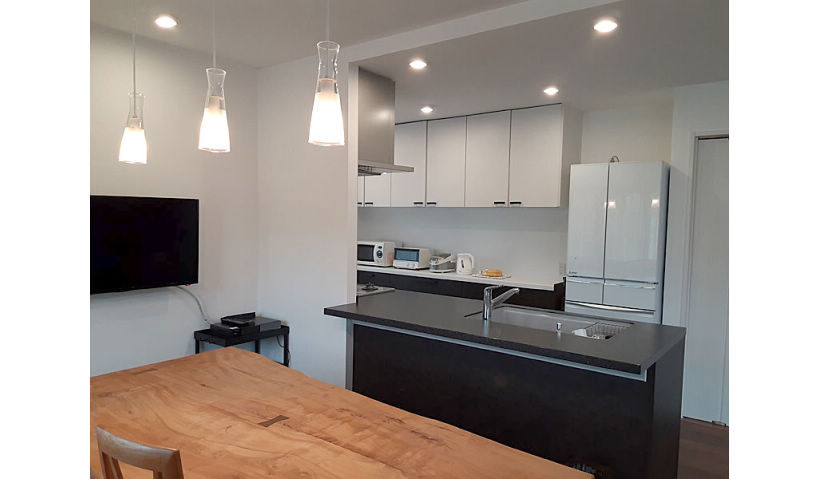 アフター:キッチン間仕切りを撤去した部分は天井の高さが少し違った為敢えて少し下げて広い空間のキッチンエリアの区切りのようなイメージを持たせた。キッチンが見えても生活感のないLDKになった。