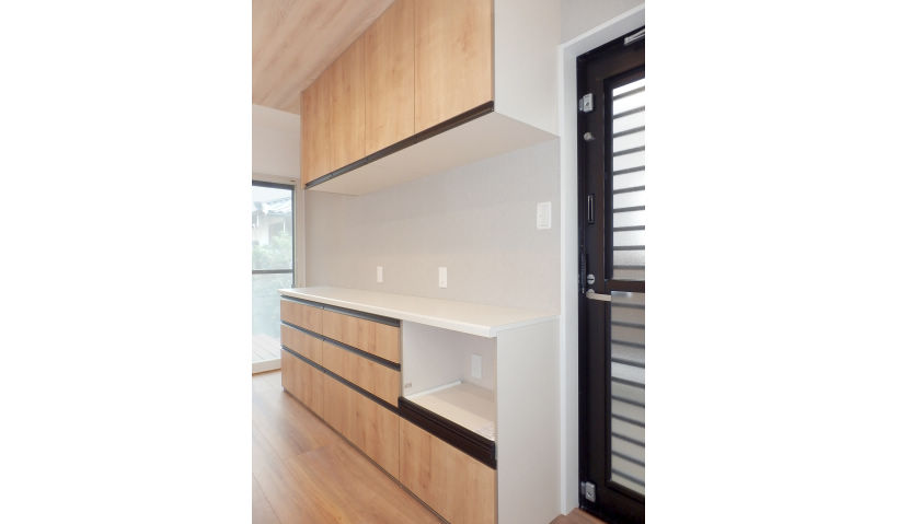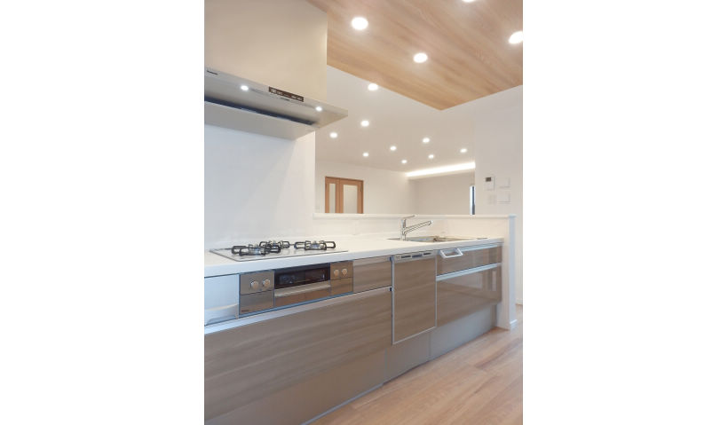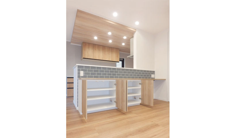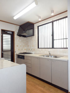 アフター:システムキッチンは、パナソニックのラクシーナです。キッチンのレイアウトを移動して、閉鎖的な壁付けキッチンから、解放感のある対面式オープンキッチンに変更しました。