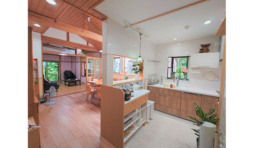 アフター:明るい色見や仕上げ材にし温かい空間に。キッチンとダイニングの床材を張り分け、異なった仕上げにし、メリハリがでました。