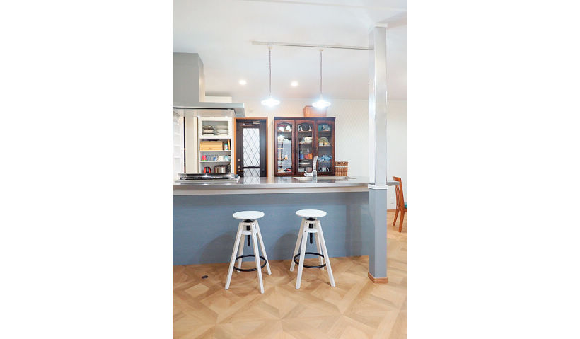 子どもたちが小さかった時には広いと感じたLDKも、子どもたちの成長と共に狭く感じるように。家族4人がダイニングに集まると圧迫感が増していました。キッチンの腰壁と垂れ壁を取り払い、明るい掃き出し窓の方向に向きを変更。天井が開放され光が奥まで届くことで開放的な空間が生まれました。またフラット対面型のキッチンを採用することで、リビングダイニングとのつながりもさらにアップ。構造上抜けなかった柱は、DIYがご趣味のご主人様がミラー調の壁紙でおしゃれな空間を演出。隣接する洗面室をパントリーに用途替えしてキッチンとつなげることで、回遊家事動線が生まれ機能面も充実しました。塾などで時間帯もバラバラになってきた子どもたちも朝食や夜食をキッチンでそのまま取れるようになり、ご家族のコミュニケーションが格段にアップしました。