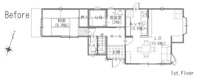 ビフォア:キッチンスペースは腰壁と垂れ壁に囲まれて閉塞感がある。西側にある独立した和室はほとんど使用されていない。