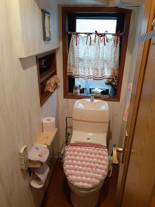 ビフォア:これまで我が家のトイレは狭いと思ってこられたお施主様ご家族。しかし奥行167センチのトイレは一般的には広いといってもいいくらいです。狭く感じた原因は内開きの扉でした。