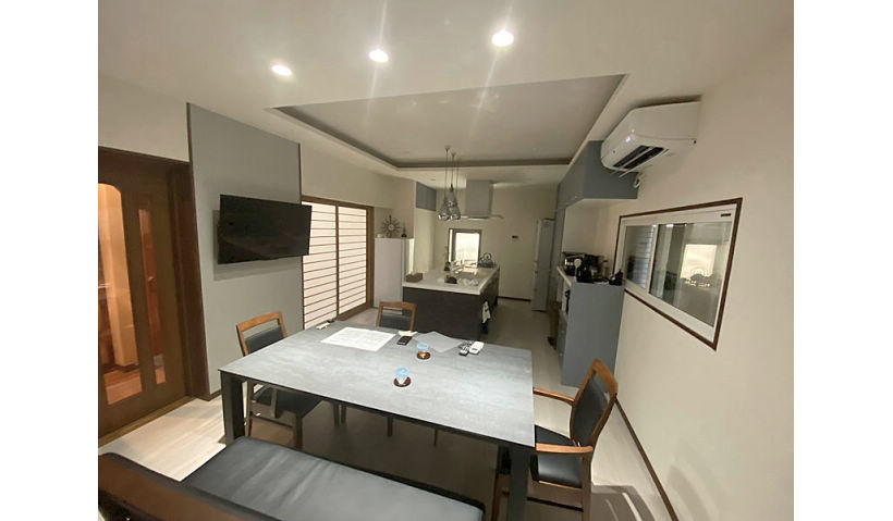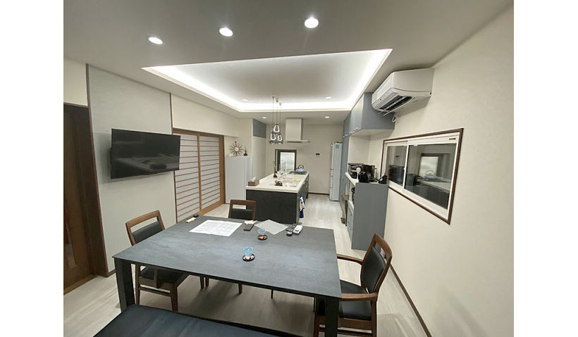 長濱 幸司 ダイニングキッチンのリフォームでアイランドキッチンにすることで、空間すべてが見渡せるようし、窓からは日差しが見込めないので、照明で空間演出できるようにした。この部屋の床壁天井に断熱材を入れ、窓は断熱サッシに変更して、快適性を上げました。
