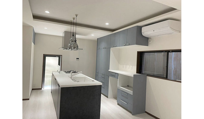 アフター:キッチンが、モデルルームのように広く、スタイリッシュになった。たっぷりと収納できるカップボードと、アイランドキッチンにも大容量の収納を併設。