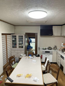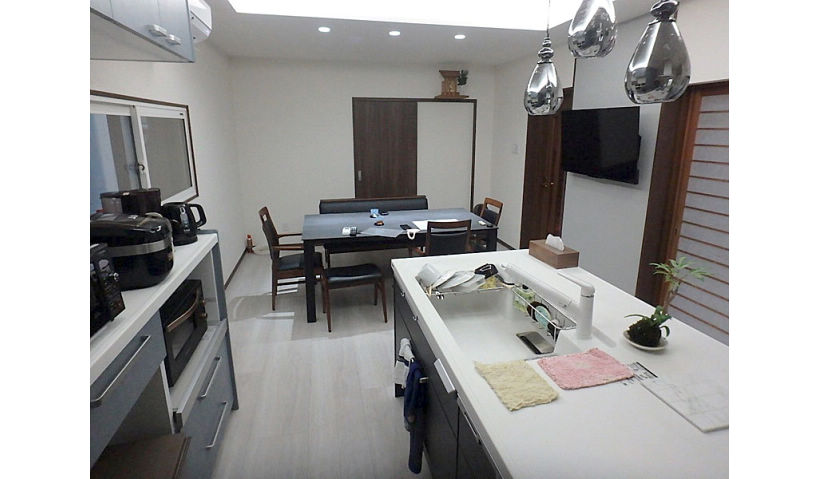 ダイニングキッチンのリフォーム、食品庫、和室の押入をダイニングキッチンに取り込み、既存の収納分は整理し、新規のアイランドキッチンとカップボードに納まることで、広い空間を得ることができました。ダウンライト、ペンダント、間接照明を使い分けることで、様々なシュチュエーションに対応できます。