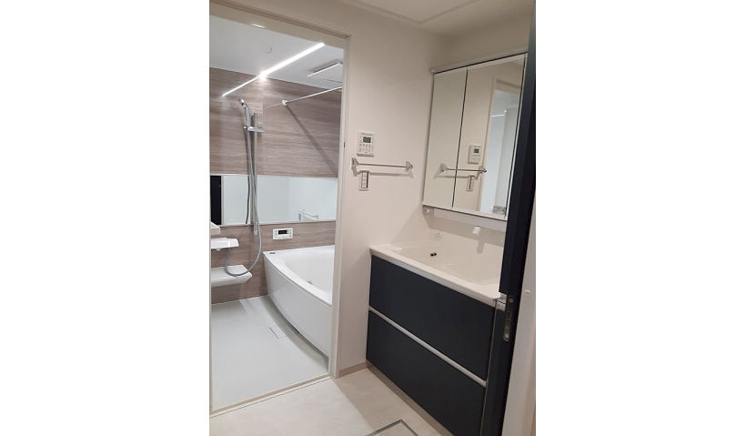 1216では実現出来なかった足をゆったりと浴槽につかる・広い洗面に細々したものが収まる収納が欲しい等のご希望を 一旦スケルトンの状態にして最大限可能なサイズの浴室と洗面化粧台を採用。浴室は人気のアクセントパネル・ライン照明とスゴピカ浴槽等に加え横長ミラーで広がりを感じる空間となった。