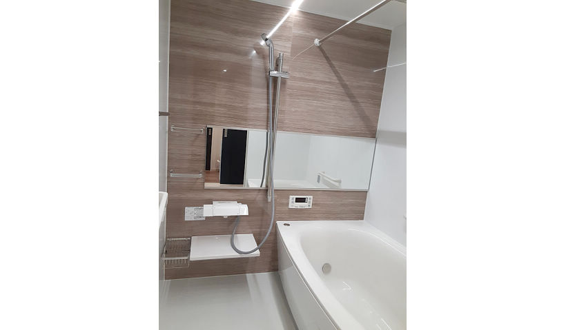 1216では実現出来なかった足をゆったりと浴槽につかる・広い洗面に細々したものが収まる収納が欲しい等のご希望を 一旦スケルトンの状態にして最大限可能なサイズの浴室と洗面化粧台を採用。浴室は人気のアクセントパネル・ライン照明とスゴピカ浴槽等に加え横長ミラーで広がりを感じる空間となった。