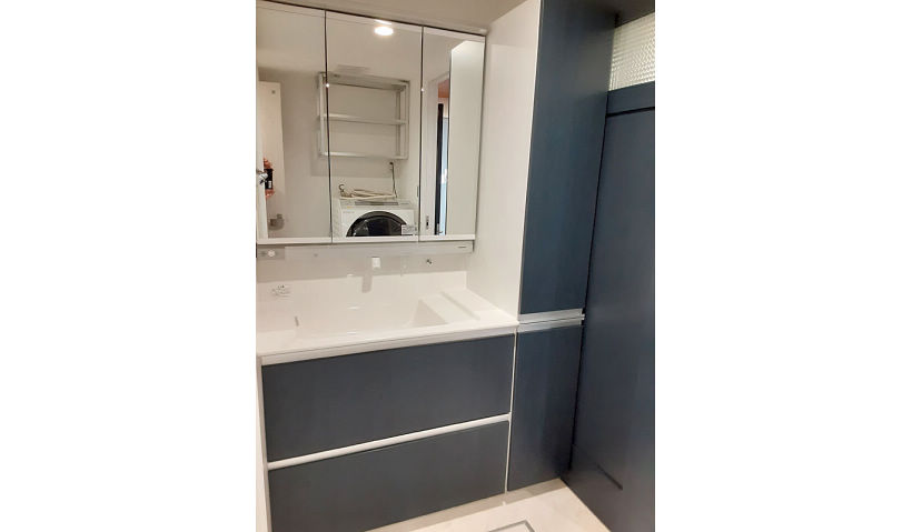 アフター:W=900にW=300の収納を新設し収納もあるゆったりとした洗面コーナーにした。ネイビーオークのドアと同じ柄の洗面化粧台は統一感がありスッキリと納まった。