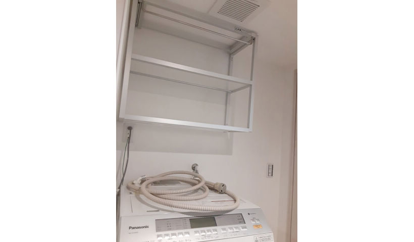アフター:洗濯機上の細々としたものを置ける上に、ハンガー類も掛けて収納できるのは便利。