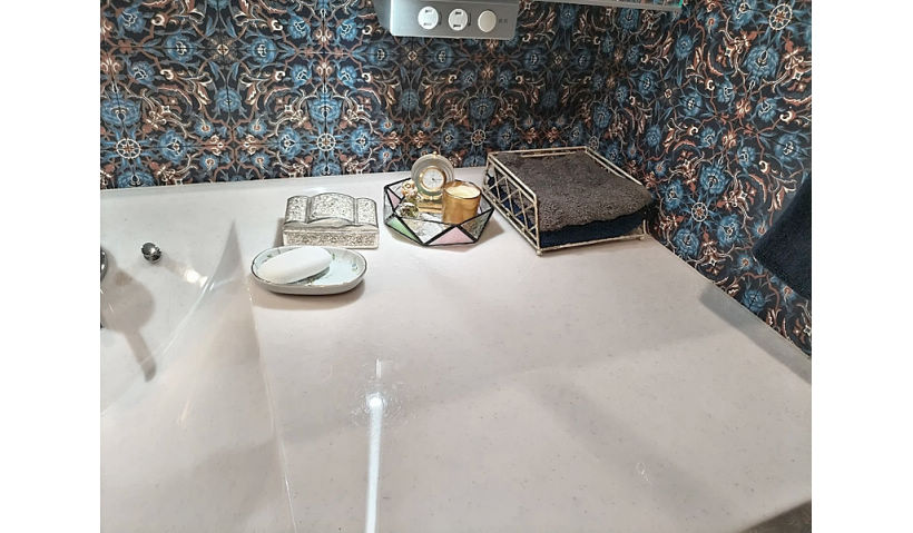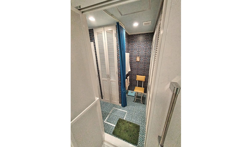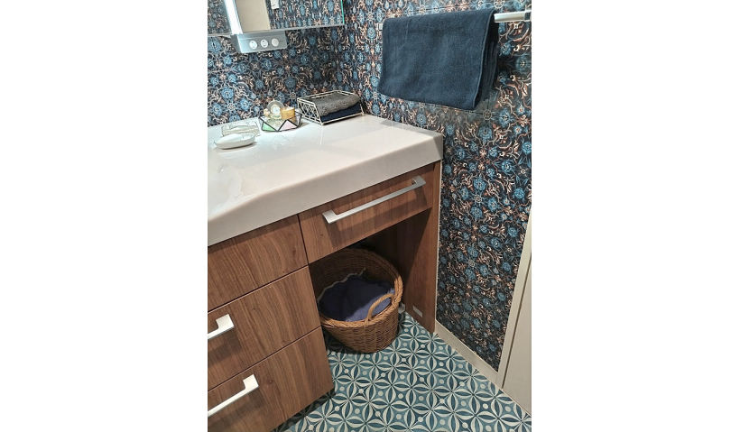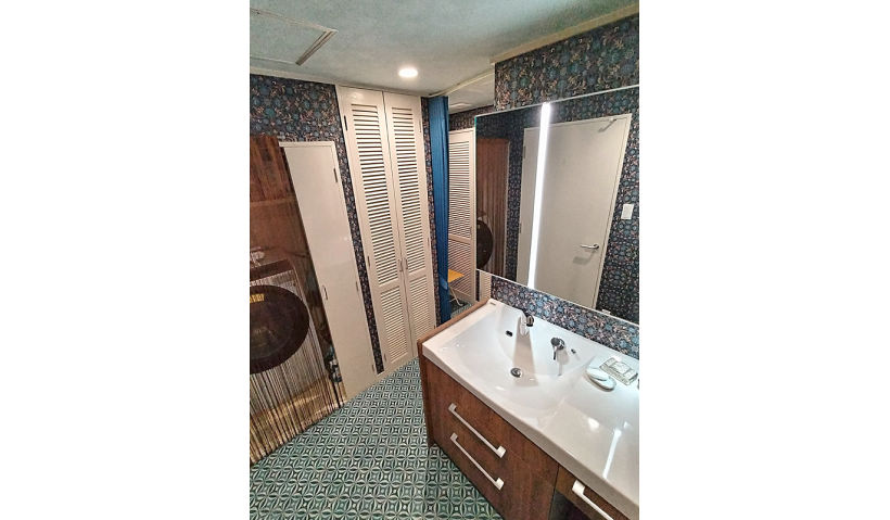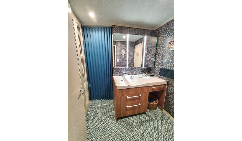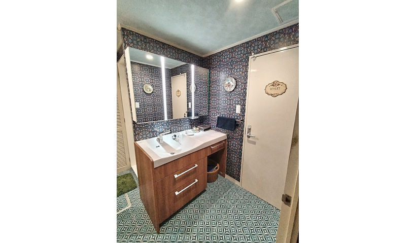 アフター:壁紙の柄、チークの面材の洗面化粧台、ブルーのカーテン、床の柄、ヨーロッパのホテルのようにマッチしている。