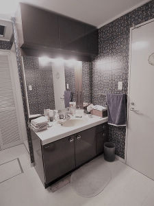 村田芳子 既存の洗面化粧台が、扉色が濃く本体天袋もあり、照明もシーリングライト1個で、洗面所全体が重いイメージでした。