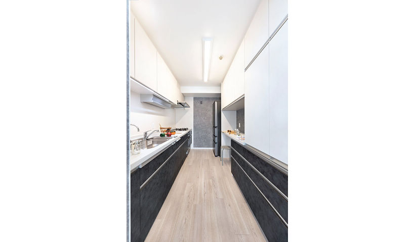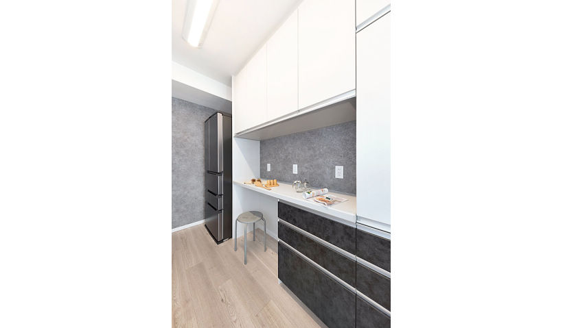 キッチン空間を使いやすくするために、スペースと収納を充実させました。あまり使用されていなかった廊下への出入口を思い切って無くすことで、カップボードの寸法を大きくとることができました。また、キッチンを2400mmから3000mmに広げるために、隣接する洋室の収納をキッチンに取り込みました。まさに個室より共用空間を大事にするお施主様ならではの思い切ったご決断でした。おかげでキッチン空間が充実し、これから料理が楽しく快適になること間違いなし!