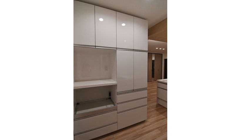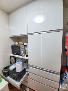 アフター:カップボードと家電収納棚は思った以上に収納量が多く、キッチンの下の引き出しの中もまだまだ余裕があるそうです。