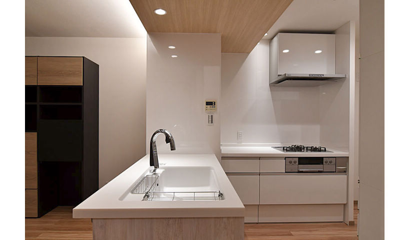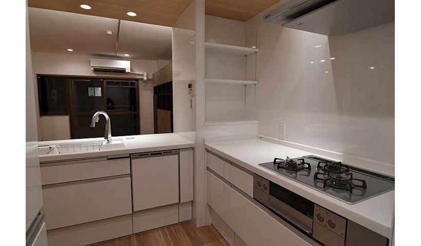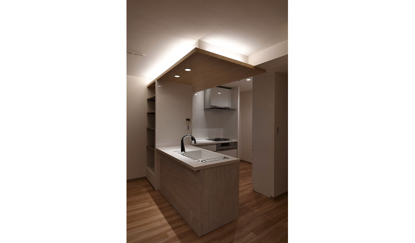 アフター:シンクは対面。Ⅱ型キッチンをL字に設置。大きな梁は梁下端に合わせ天井を造作。間接照明を設置。圧迫感のない広々したLDKになりました。