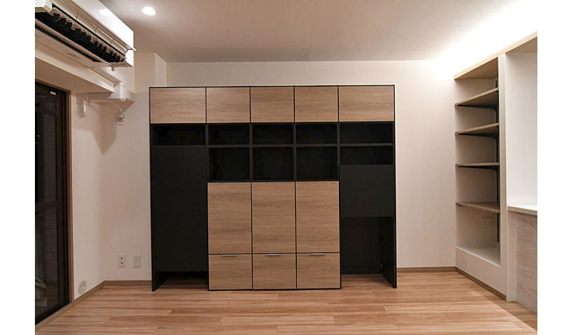 アフター:キュビオスはツートンカラーでリビングのアクセントに。オープンキャビネットで見せる収納。扉部分には雑然としがちな小物雑貨をスッキリ収納。