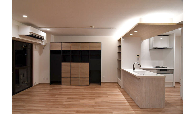アフター:キッチン上部は天井を一段下げてダウンライトと間接照明を設置。