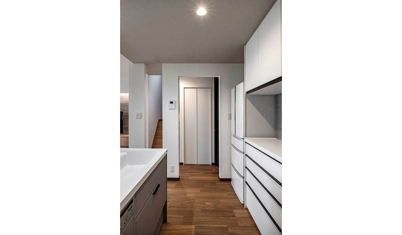 アフター:壁と一体化した収納扉は、階段下のスペースにも設置されています。ここには季節ごとの機器やゴルフバッグなどを、高さに合わせて収納しています。この使い勝手の良い収納方法により、空間を有効活用している印象が感じられます。
