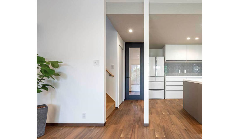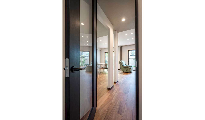アフター:クラフトレーベルの硝子戸がLDKへのゲートとして設置。お部屋に入る前からワクワク感が広がります。