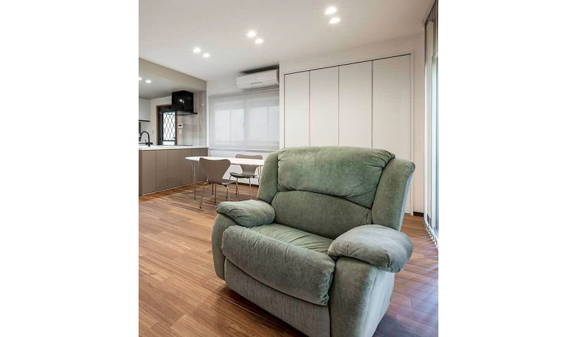 以前は収納が少なく、ご家族が物を色々なところに置いてしまっていたため、奥様がお片づけを頑張ってもなかなかすっきりしませんでした。それらの課題を改善するために、デザインやレイアウトだけでなく、小さな物の収納場所や家電家具の配置まで、リフォーム前に計画しました。これにより、必要なものと不要なものを選別し、新たな家具を購入する決断を下すまでの一連の流れが実現し、トータルコーディネートが可能となりました。