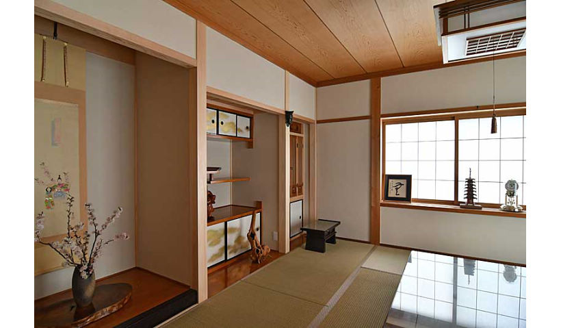 仏壇は以前特注で作ったものだったので、再利用を希望されていました。南西の和室にあった仏間を大工職方によりその部分を移設して床の間・違い棚・仏間を新設し、本格的な和室を新設。壁は明るめの珪藻土仕上げとし明るく風格のある和室とした。