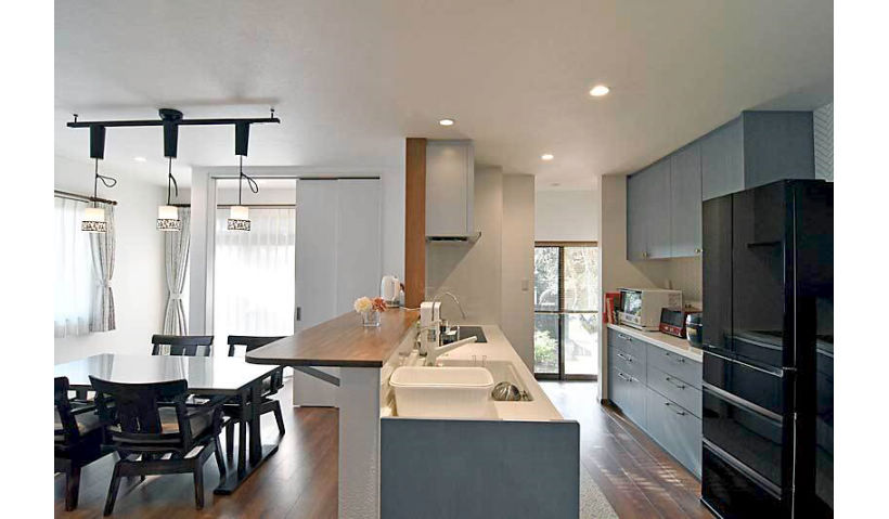 アフター:奥のサッシのあるところはゴミの一時置場で、キッチンがすっきりと使えるのに役立っている。対面のI型キッチンに奥行きが650のカップボードを新設。