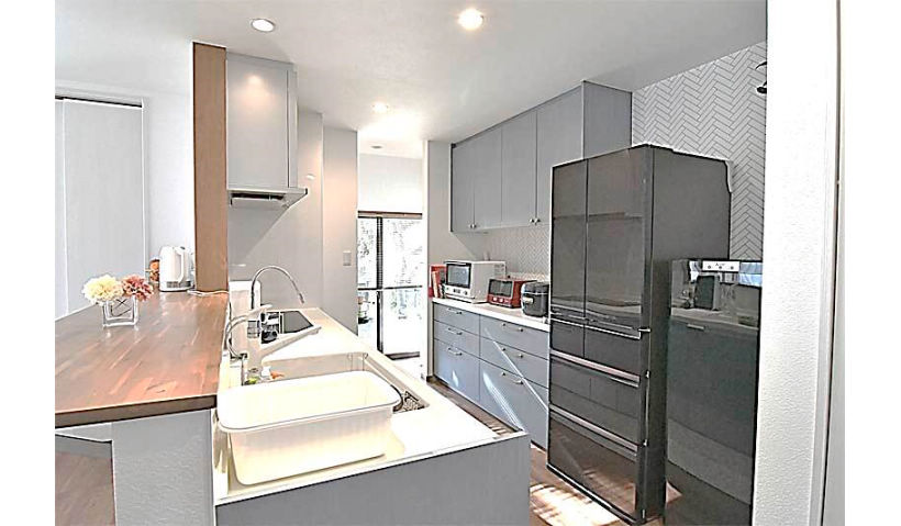 アフター:右に見えているのはパントリーで奥行きが深くL型に棚を設置しキッチンをすっきり使うのに便利。