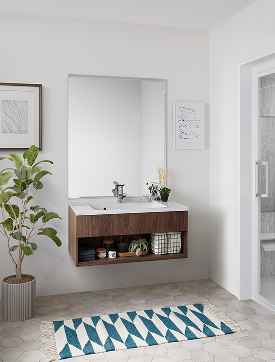 就寝前のリラックスした時間を過ごす洗面空間は、落ち着いた雰囲気に。カラーはシンプルにすることで、北欧カラーをアクセントに取り入れたり、小物を飾ったり、自由に北欧スタイルを楽しめる洗面空間になります。