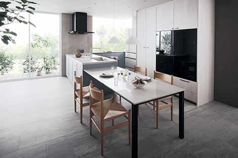 キッチンカウンターと同じ素材のダイニングテーブルを並べて設置すれば、統一感のあるダイニングキッチンが実現します。キッチンの真横につなげることで配膳もしやすく、使い勝手も抜群です。