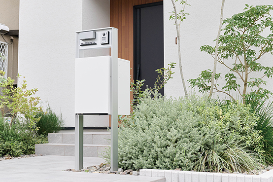 ポストと一体になっているので、ボックスが一つで玄関まわりがスッキリ。住まいに合わせて「壁埋め込み」「据え置き」など、設置スタイルも選べます。