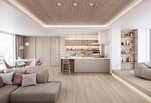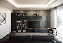 おもてなし空間となるリビングは、空間を広々と使えるように家具は最小限に抑えています。壁のテクスチャーに間接照明を当てることで生まれる美しい陰影により、モダンでありつつもくつろげる空間に仕上がっています。
