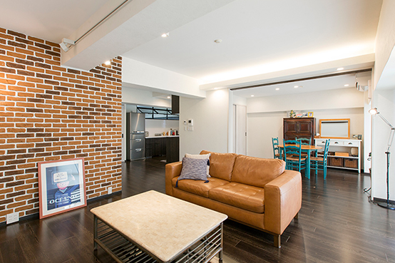 築33年のマンションリフォームで実現したヴィンテージスタイルのリビング。雑誌を見たり、アパレルショップやモデルルームに通って、素敵だと思うイメージから奥様が選んだのがヴィンテージスタイル。全体の配色、アクセントタイル・壁紙など、随所にアイディアが散りばめられた空間です。