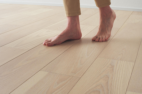 パナソニックの床材「マイスターズウッドフロアーkihada」は、木目の凹凸が心地よい足ざわりで、裸足でも心地よく過ごせます。床暖房にも対応しているので、夏も冬も素足で快適に過ごせます。