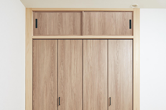 押し入れの解体費用や工事日数が気になる場合は、既存のふすまにレールを取り付けるだけで、設置できる折れ戸があります。押し入れのふすまが簡単にクローゼット扉になり、扉柄も選べて、天袋も含めてコーディネイトできます。