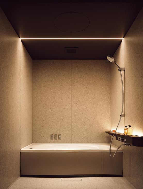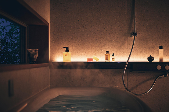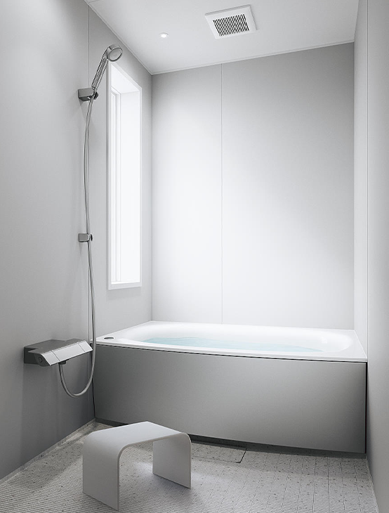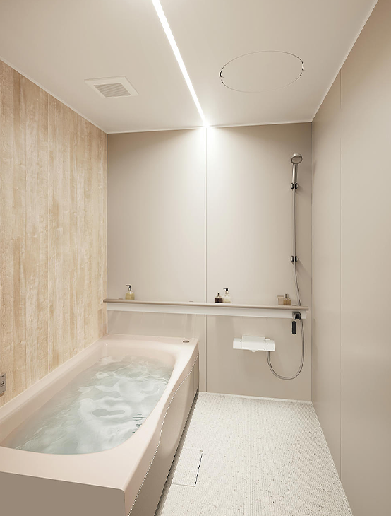 湯船につかる時間は、心と体をゆるめる大切なひとときです。リクライニングチェアのように身体を預けられる形状の浴槽を取り入れ、マイクロバブル入浴で身体をしっかり温めます。