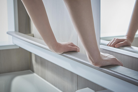 浴槽までつながった手すりは、立ち座りや浴室内の移動、浴槽をまたぐときにもしっかりサポートします。握らず、面で支えるから姿勢が安定します。