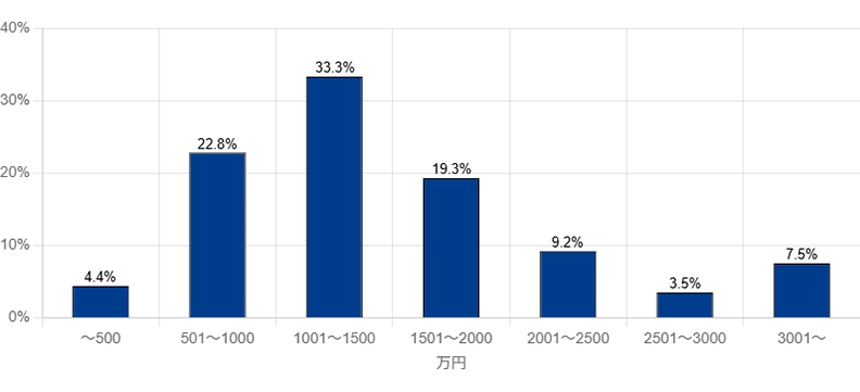 戸建て住宅をリフォームした事例の中で、最も多かった価格帯は「1,001~1,500万円」でした。次に「501~1,000万円」「1,501~2,000万円」の順番になっています。全体では「501~2,000万円」までの価格帯が全体の約75%を占めています。