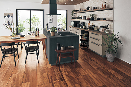 キッチンを中心にLDKを大幅リフォーム。間仕切りをなくして開放感を高め、収納力のあるカップボードや調湿・脱臭機能付き内装材で快適性も向上。ヴィンテージモダンな温もりのある空間に。
