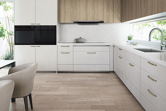 キッチンは動線を整え、設備はスキマレスシンクやセンサー水栓で清掃性と利便性をアップ。白を基調に、自然素材の壁や床で明るく快適な空間にリフォーム。