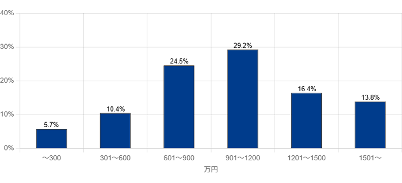 マンションのリフォーム費用は、専有面積や選ぶ設備のグレードによって異なります。マンションのリフォーム事例を集計したところ、最も多い価格帯は「901~1,200万円」、次いで「601~900万円」、「1,201~1,500万円」という結果でした。