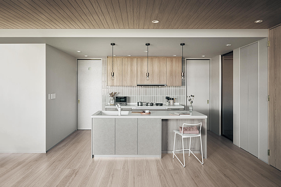 子どもたちの成長をきっかけに、内装と設備を一新。対面キッチンに変更し、垂れ壁を撤去して開放的な空間に。腰壁のレンガ風のブルックリンタイルと吊り下げ照明でカフェ風の雰囲気に。寝室には室内窓を設け、採光と通風を確保。デザインと快適性を両立した住まいになります。