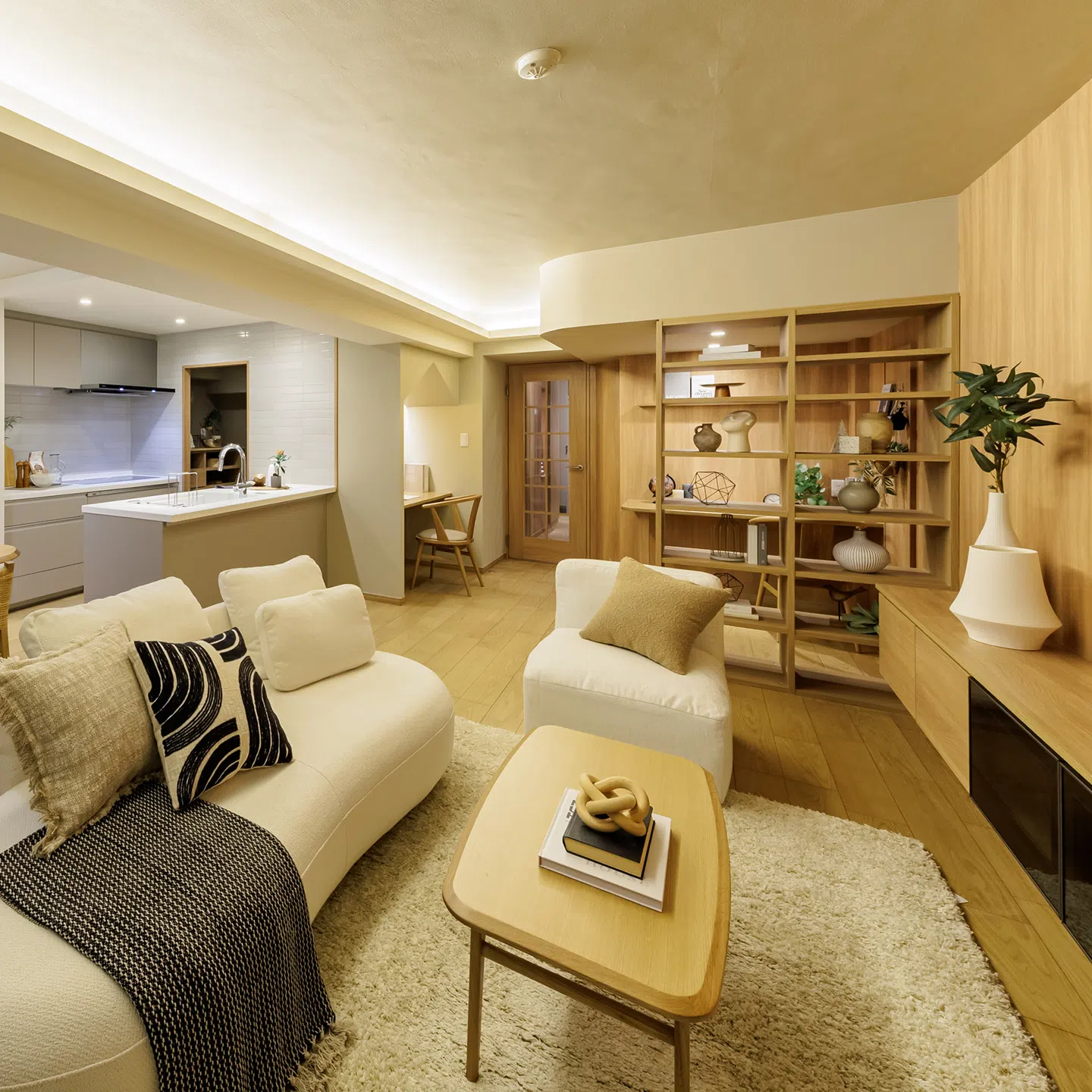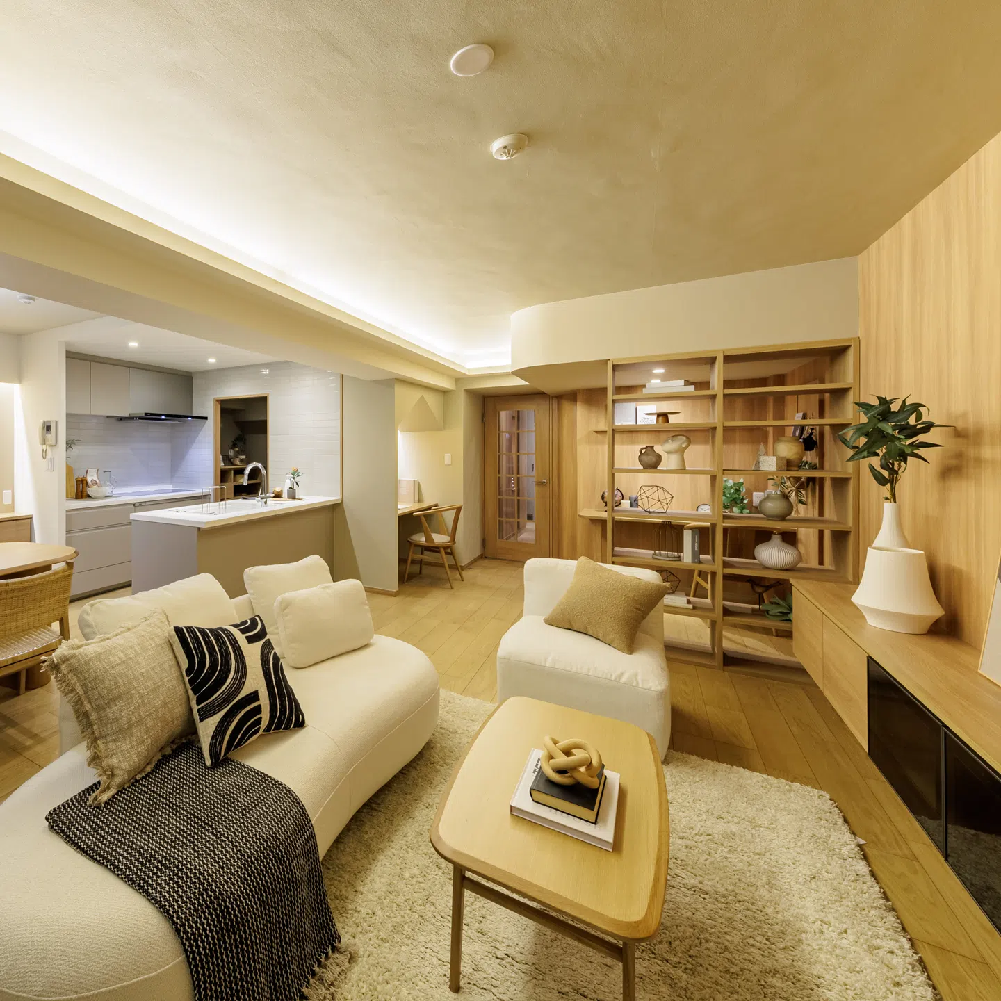 床、建具、造作をすべてオーク系でまとめ、やさしいホワイトとグレーで中和した人気のコーディネイト。各所に個性を感じる垂れ壁を設けることで、物件の印象付けと差別化を両立しています。