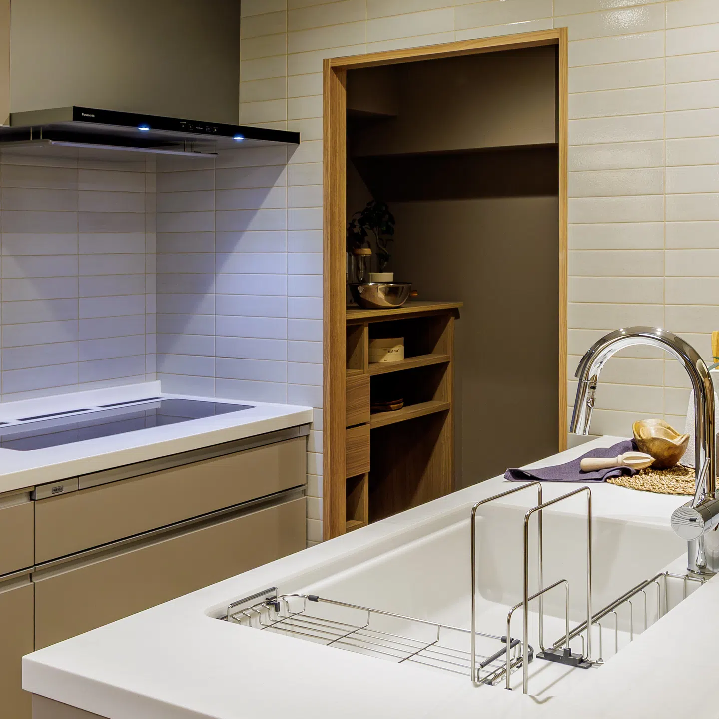 キッチンはシンクとコンロがセパレートのⅡ型を採用。最小限の動線でテキパキお料理が可能。奥のスペースはたっぷりのパントリーに。
