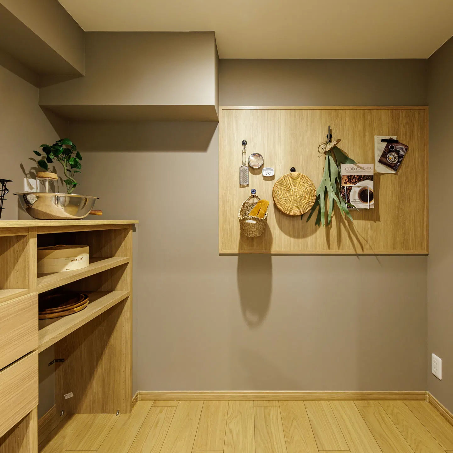 大人の落ち着きが感じられるやさしい色合いのクロスにキッチンの上品なグレー系の扉色を効かせ、天井の羽目板や収納の木目が温かみのあるアクセントに。シンプルでモダンな明るい印象に仕上げています。