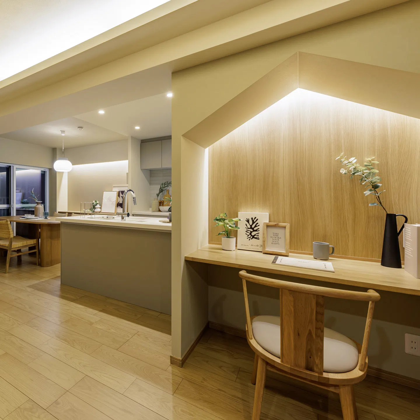 キッチン側のデスクスペースは屋根型の垂れ壁を設けておこもり感のある集中スペースに
