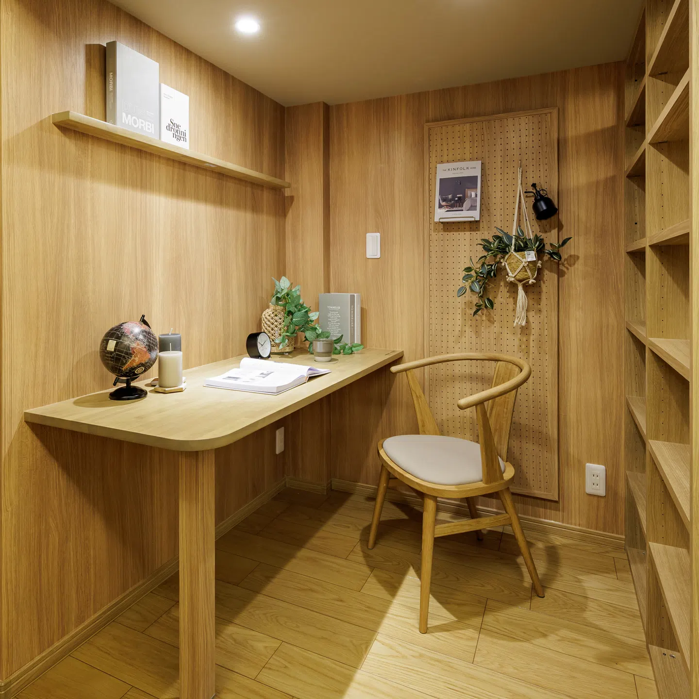 部屋を隔てていた梁が大空間化によりLDKの真ん中を貫いてしまう…。そんなケースでも、梁を活用した照明プランとアクセント壁に視線を集めるアイディアで、心地の良い空間へと刷新。オープンながら集中しやすい工夫が施された2カ所のデスクスペースにもマネしたいアイディアが随所に。木目柄を基調にしたコーディネイトも、ぜひご参考に。