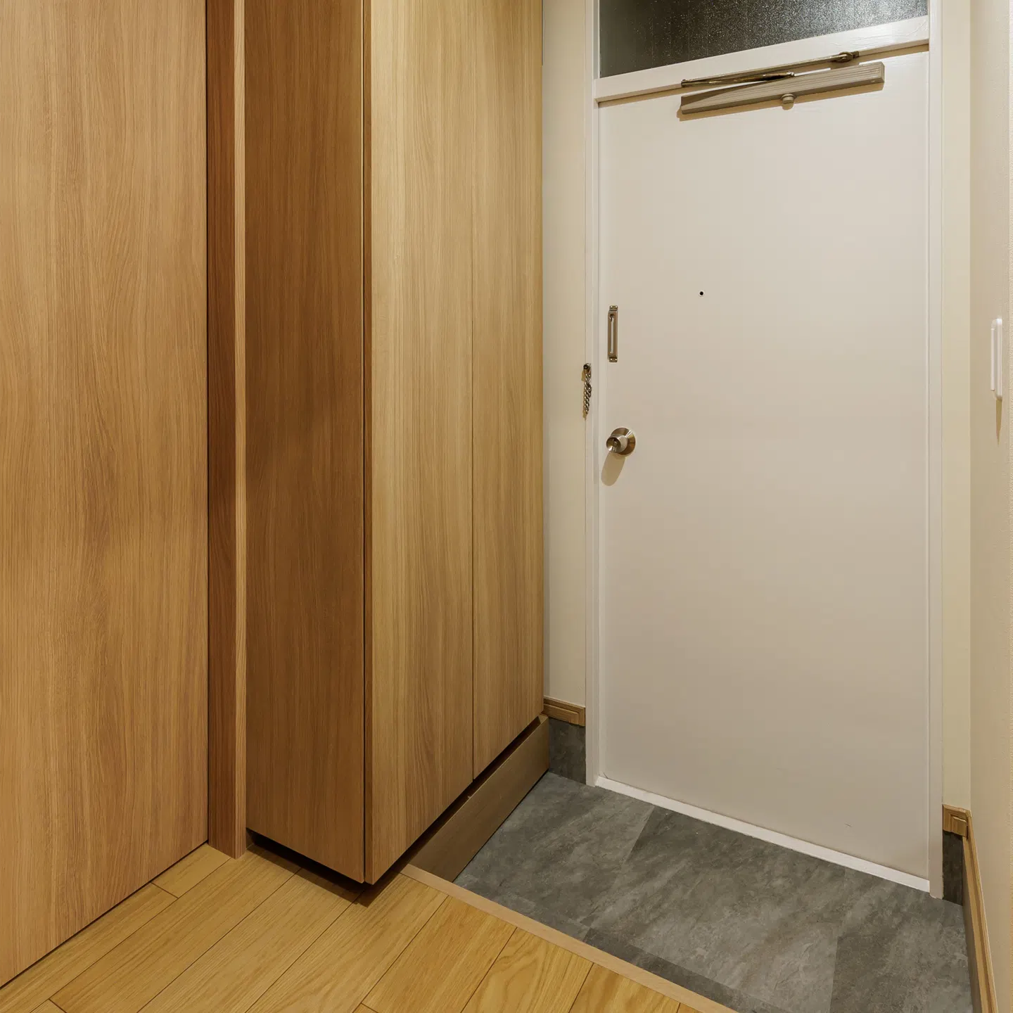 天井いっぱいまでのたっぷり収納を玄関に。足もとを浮かすことで、圧迫感を減らす工夫を