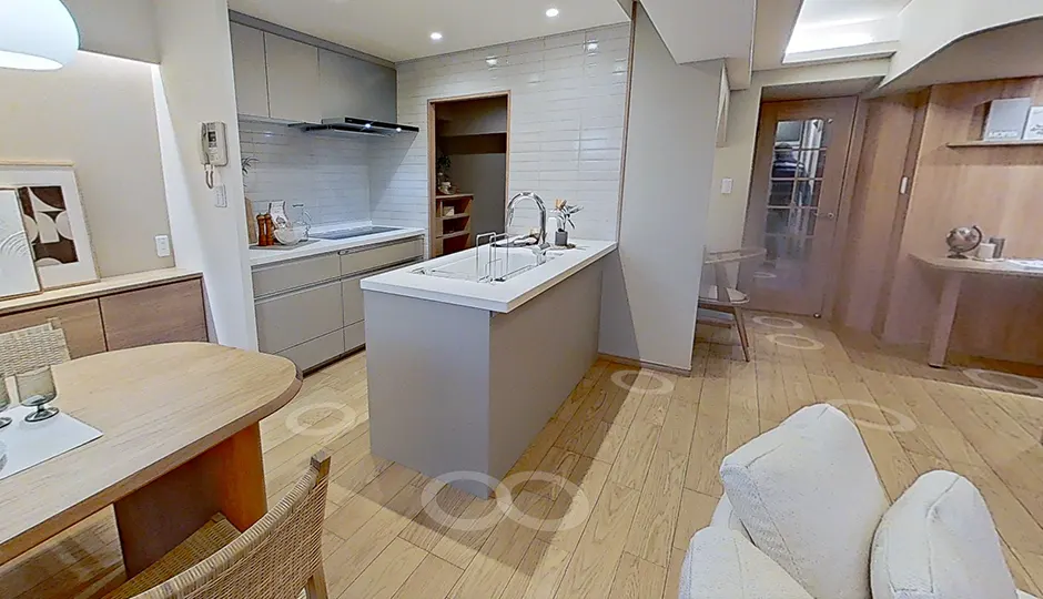 ダイニングキッチンからリビングへの建具の左右壁に角ができないようにすることで空間に広がりとつながりを感じさせるだけでなく、自然と家族をリビングに導く視覚的な効果も。