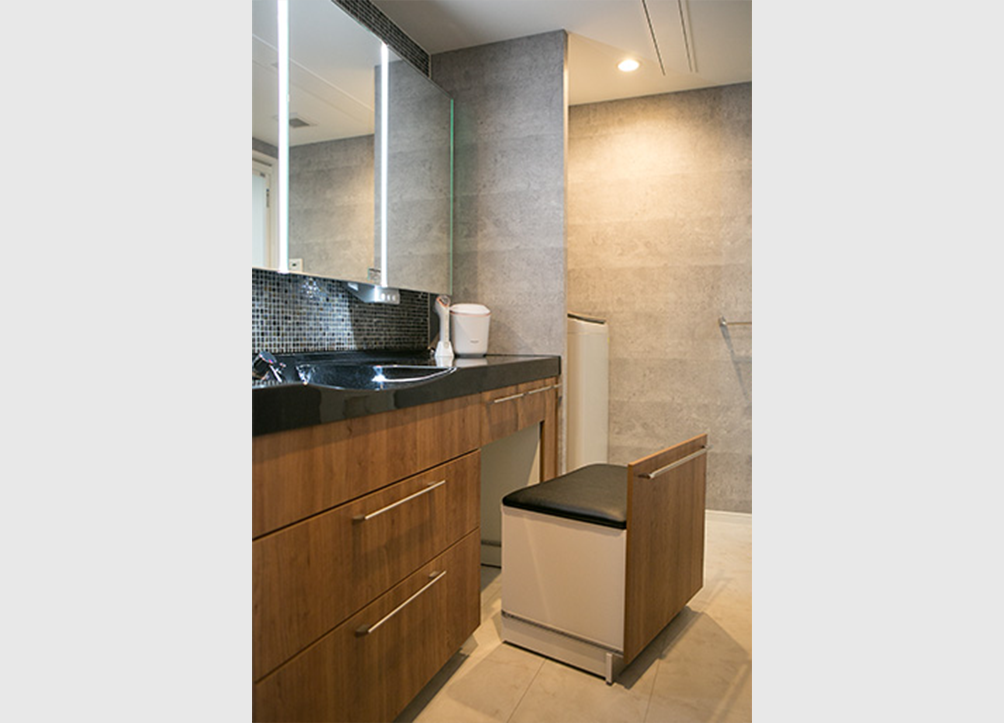 - 洗面ドレッシングの下には椅子を置き、フェイシャルケアやメイクタイムをゆっくりと